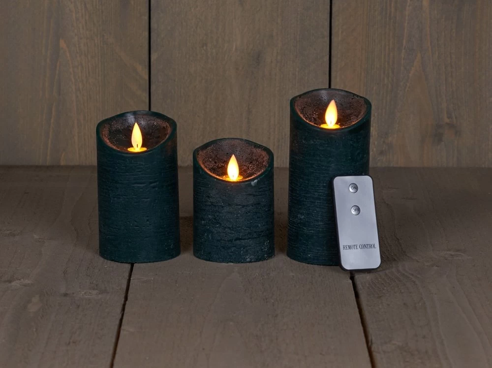 Anna’s Collection 3st. LED Rustiek wax stompkaars Antiek groen – Ø 7,5 x H 10/12,5/15 cm