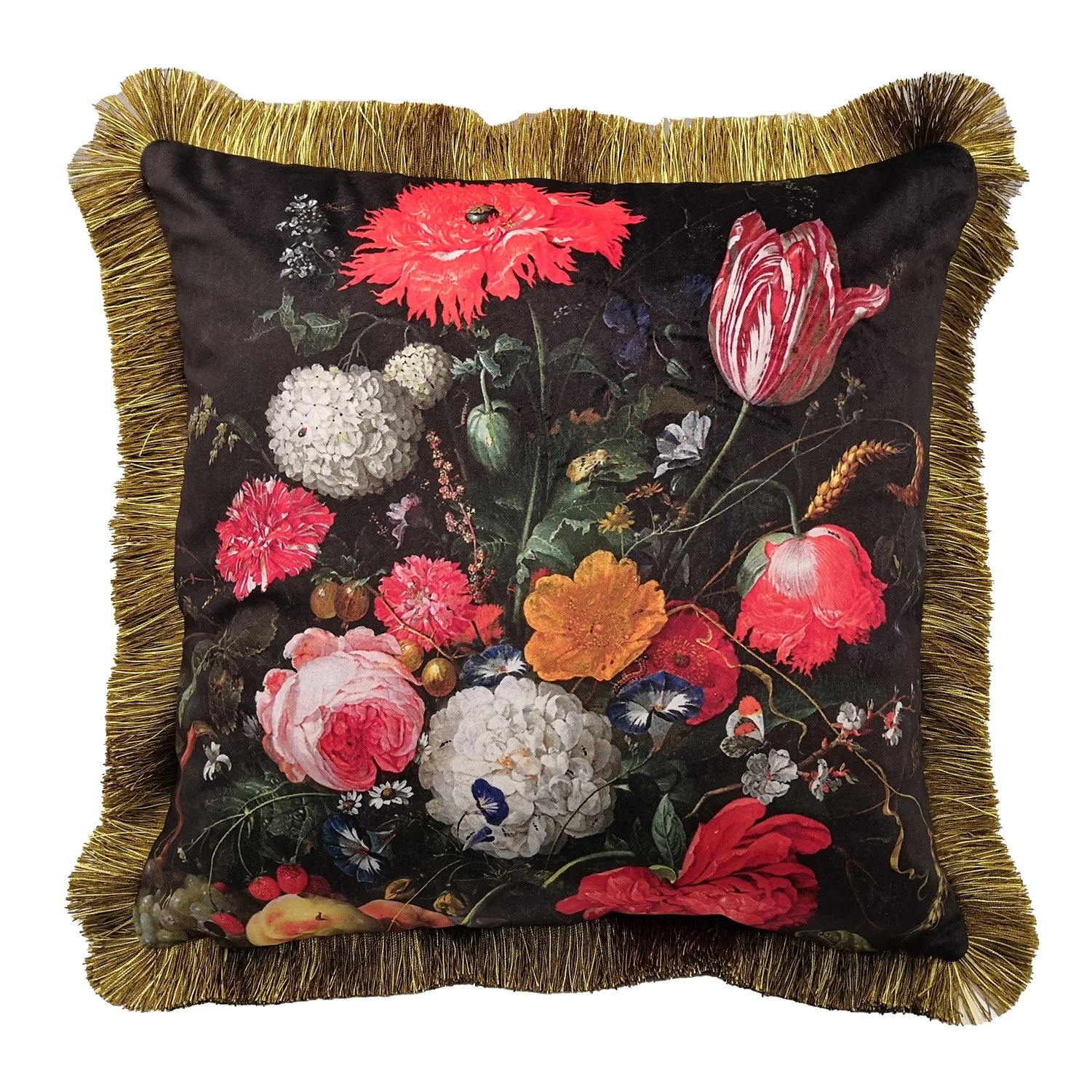Velours kussen met boeket decor. Dit sierkussen is gemaakt van polyester en is geschikt voor de woonkamer, slaapkamer of als ander decoratieve woonaccessoire. Het vierkante kussen is de perfecte toevoeging voor elke bank, stoel of op het bed. Dit kussen brengt een stukje nostalgie in jouw interieur.